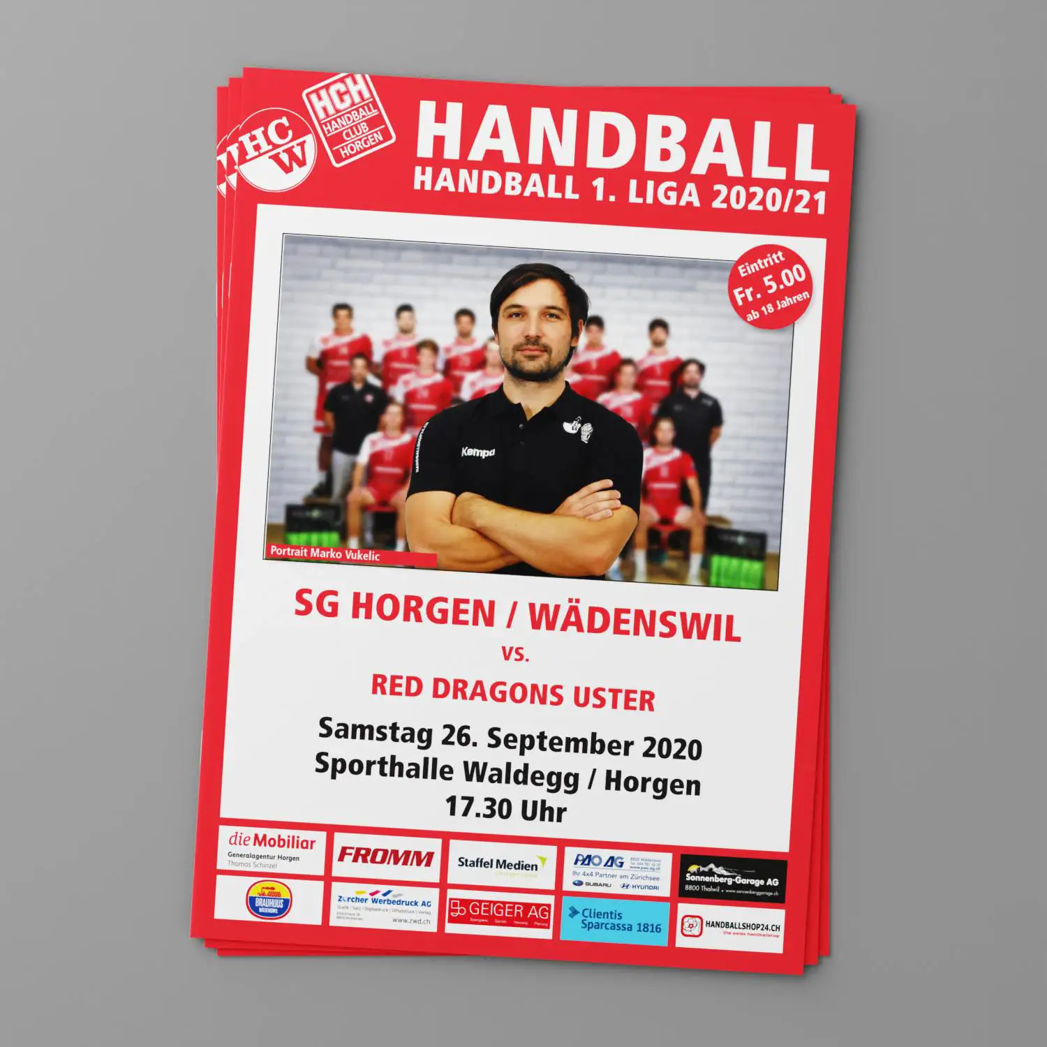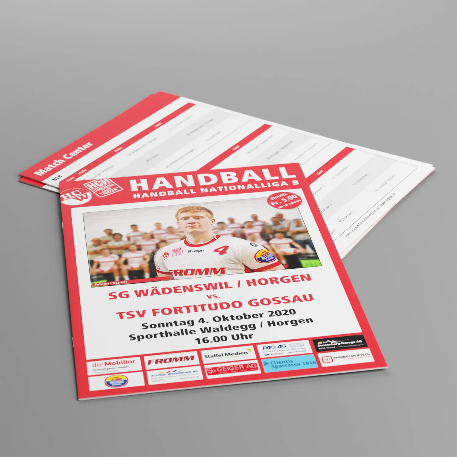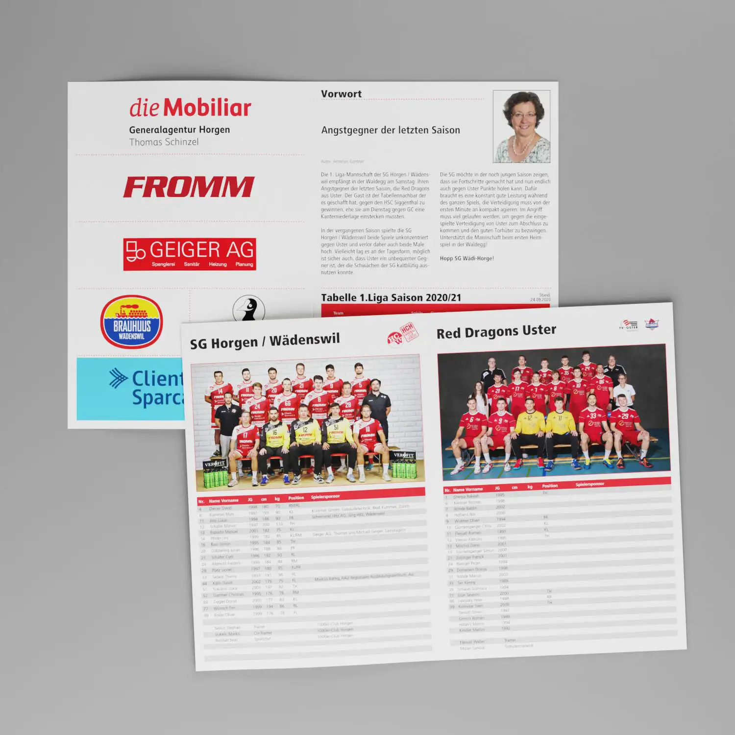 Nicht so für die Handball-Spielergemeinschaft der SG Wädenswil/Horgen. Die SGHW produziert für die NLB- und 1. Liga-Mannschaft Programmhefte für die Heimspiele. Um den Aufwand in Grenzen zuhalten, haben wir eine zeitsparende und praktische Lösung gefunden, unser Web2Print Business-Portal. In ein vorbereitetes Layout werden online jeweils die aktuellen Spieler- und Matchdaten, neue Fotos und Texte in die Platzhalter eingefügt und das Programm fertig gestellt. Danach wird das „Gut zum Druck“ digital über unser Web2Print Business-Portal generiert. Der Benutzer kann das „Gut zum Druck“ online prüfen und im System freigeben. Mit ein paar Klicks, wird der Druckauftrag minutenschnell mit hinterlegten Daten wie Auflage, Papier, Format und Lieferadresse abgeschlossen.